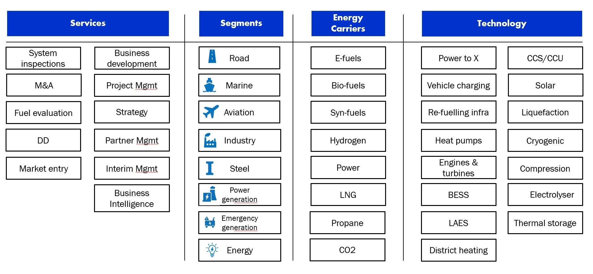 Our clients are typically leaders in following sectors: Investment, P2X development, Power & heat generation. Aviation, Refinery and Chemicals, Ports, Shipping, Infrastructure. Steel, cement, and other heavy industries